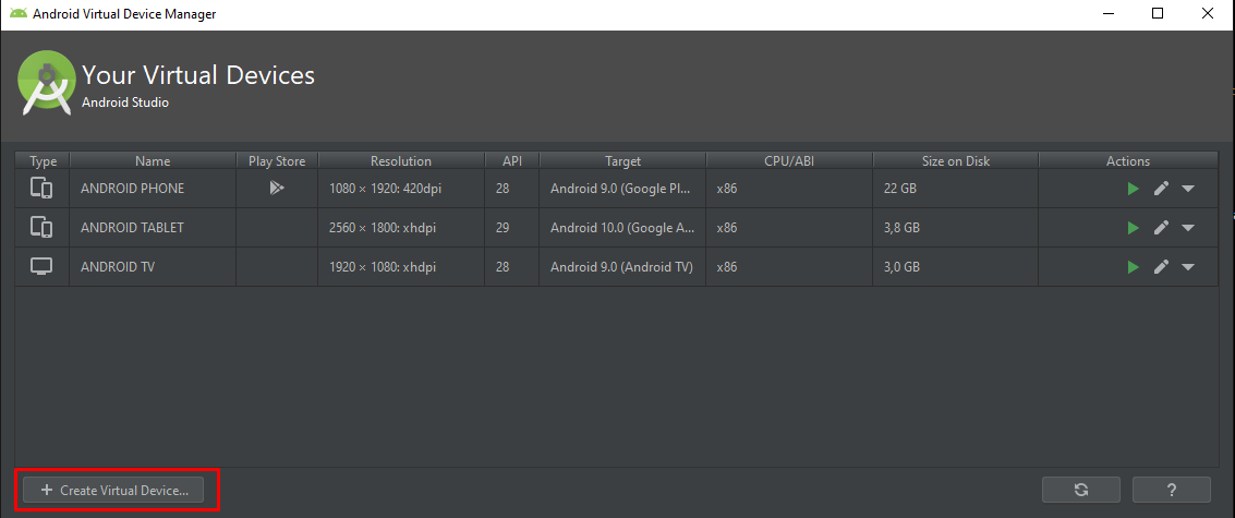 Gelen AVD Manager penceresinden Create Virtual Device butonuna tıklayalım.