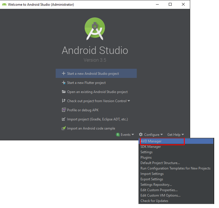 Emulator eklemek için ilk olarak Android Studio karşılama ekranın da Configure / AVD Manager seçeneğini tıklıyoruz.