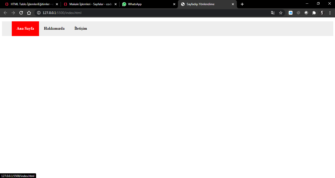 3 sayfadan oluşan websitemizde sayfalar arasında geçiş yapabiliyoruz. Hangi sayfanın aktif olduğunu menüden anlamak için <style> etiketi içerisine bir sınıf tanımlamamız gerekmektedir. Onu bir sonraki dersimizde uygulayacağız.