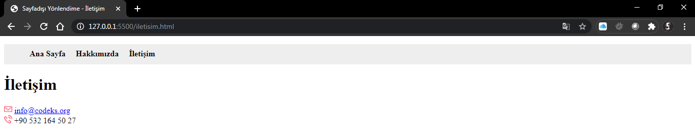 Aynı işlemi iletişim.html dosyasında yapıp <h1> içeriğini İletişim olarak güncelleyelim.