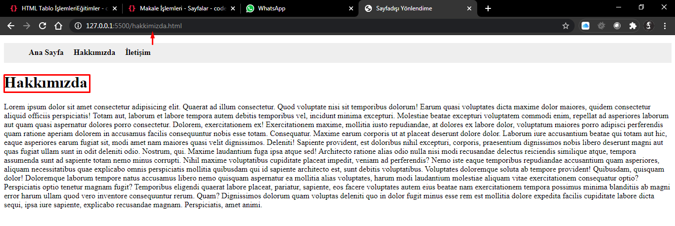 hakkimizda.html dosyasını açıp düzenleyelim. <h1> etiketi içerisindeki Ana Sayfa yazısını Hakkımızda olarak güncelleyelim. Dosyayı kaydedelim.