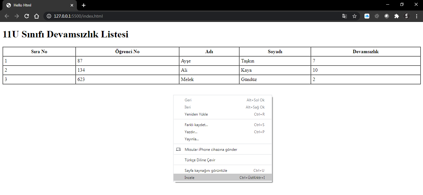 Öncelikle senaryonumuzu belirleyelim. Örneğin 11U Sınıfı Öğrenci Devamsızlık Listesini görüntülediğimiz bir tablo oluşturalım. Kayıtlar Sıra No, Öğrenci No, Adı, Soyadı ve Devamsızlık ana başlıklarına listelenecek ve 3 adet kayıt listeleyeceğiz. Haydi başlayalım.