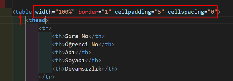 Görseli biraz daha şık bir hale getirmek için <table> etiketimize birkaç tane parametre ekleyelim.