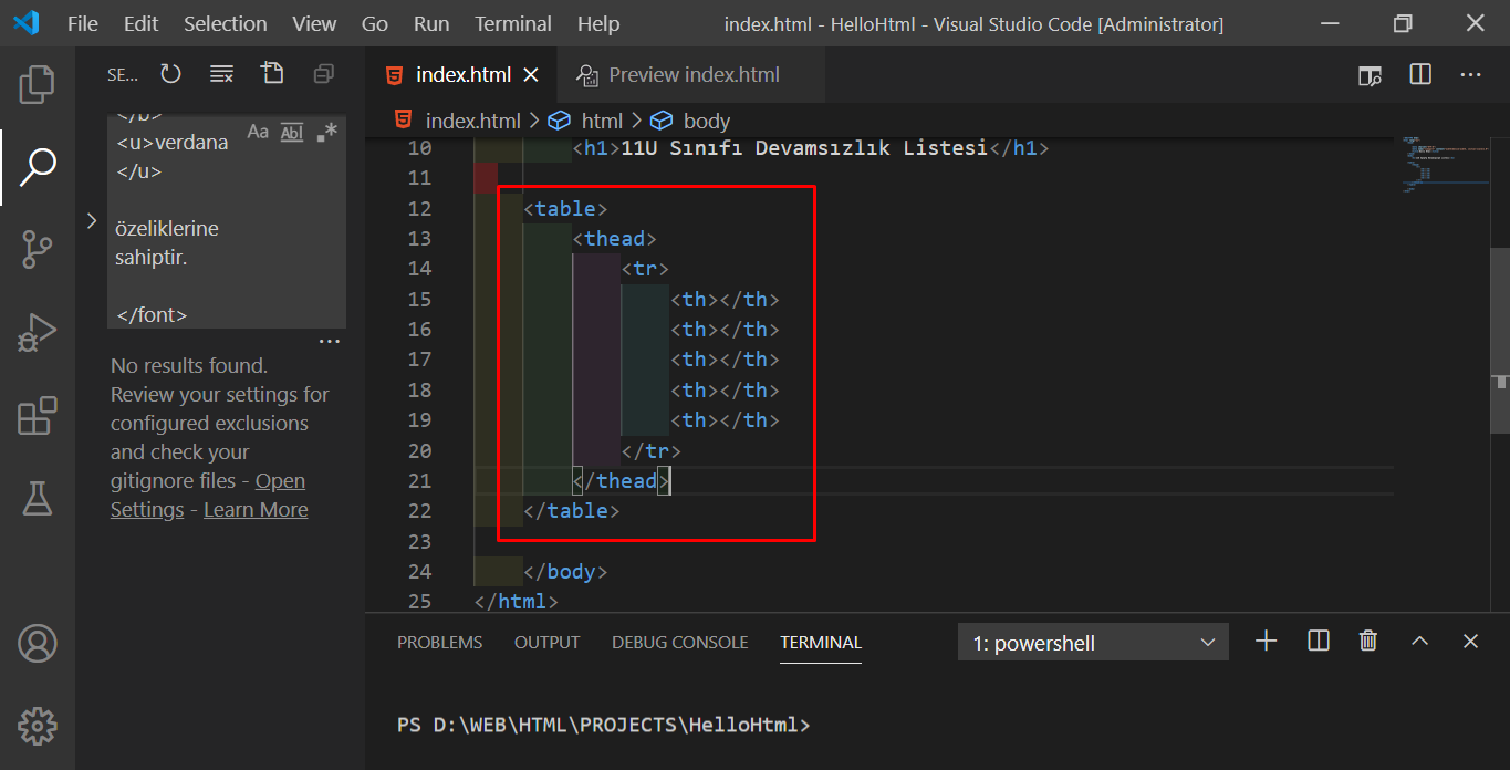 Ana başlıkları <th> etiketlerinin içerisinde <th>Sıra no</th> şeklinde sırayla yazalım. 5 adet başlığım olduğu için th*5 yazmıştım. Sonrasında başlık bölümünün bittiği yerden </thead> sonra hemen tbody>tr*3>td*5 Emmet kodunu yazalım.