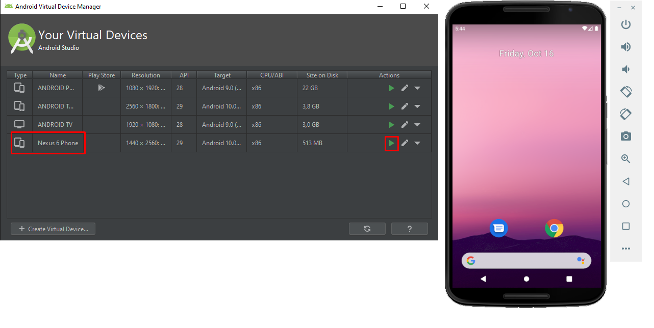 Eklem işlemi tamamlandıktan sonra AVD Manager penceremizde yeni cihazımızın ismini görebilir. Cihaz adının sağındaki Play butonuna tıklayarak yeni Emulatörümüzü çalıştırabiliriz.