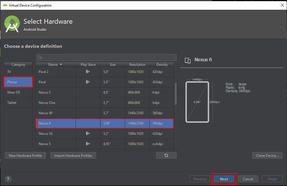 Açılan Virtual Device Configuration penceresinden herhangi bir Cihazı seçerek Next butonuna tıklıyoruz.