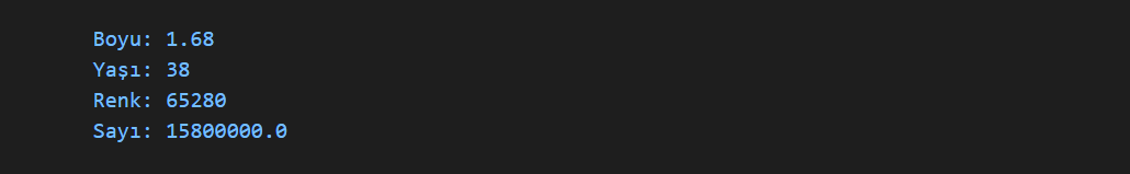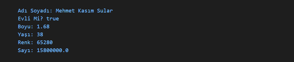 var adi="Mehmet Kasım", soyadi="Sular", evliMi=true, boy=1.68,yas=38, renk=0x00ff00, eSayi=158E5;