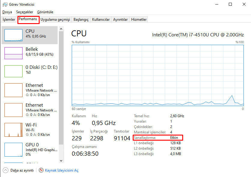 Bunun için CTRL + ALT + DEL yaptıktan sonra gelen seçeneklerden Görev Yöneticisini çalıştıralım. Performans sekmesini tıklayıp Sağ altta Sanallaştırma durumunun Etkin olup olmadığını kontrol edelim. Sanallaştırma hatası alıyorsak bu bölüm etkin değildir.