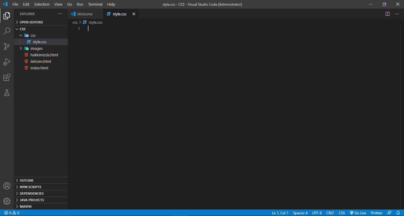 Html dosyalarımızla aynı dizine css adında bir dizin oluşturalım ve içerisine style.css adında bir CSS dosyası oluşturalım.